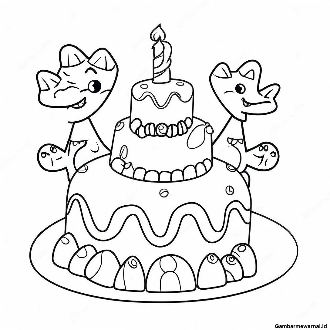 Gambar Mewarnai Kue Ulang Tahun Dengan Dinosaurus Yang Berwarna Warni