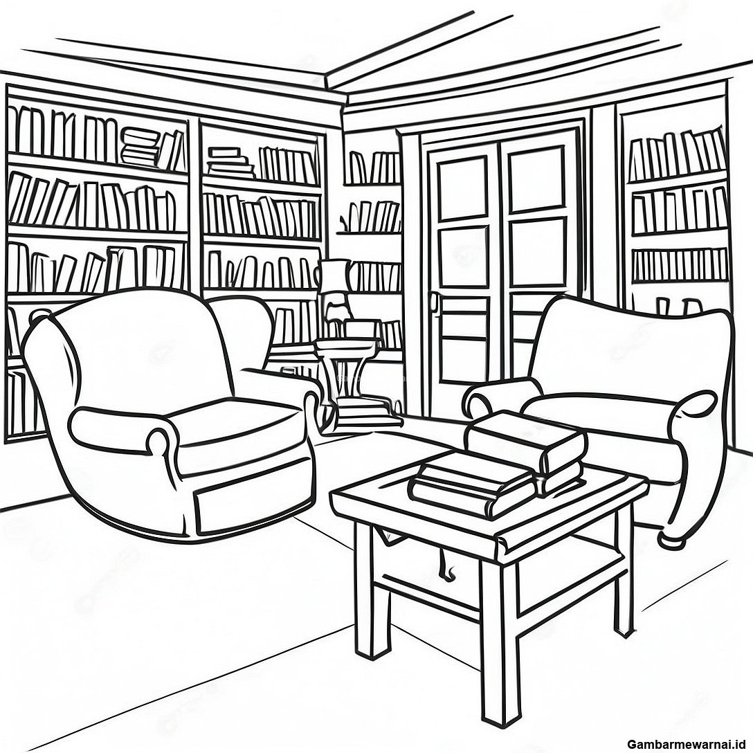 Halaman Mewarnai Adegan Perpustakaan Yang Nyaman
