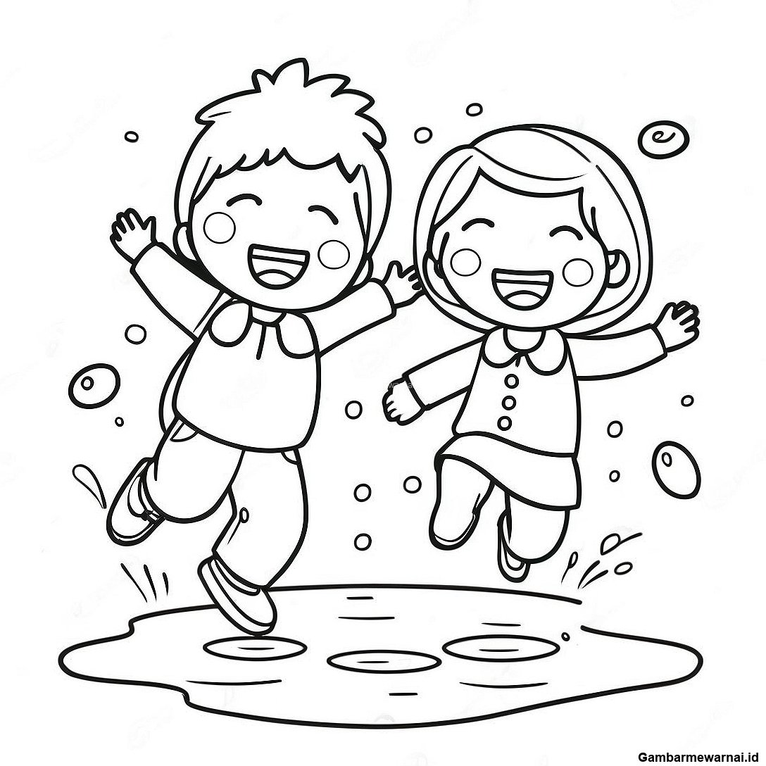 Halaman Mewarnai Anak-Anak Bahagia Melompat Di Genangan Air