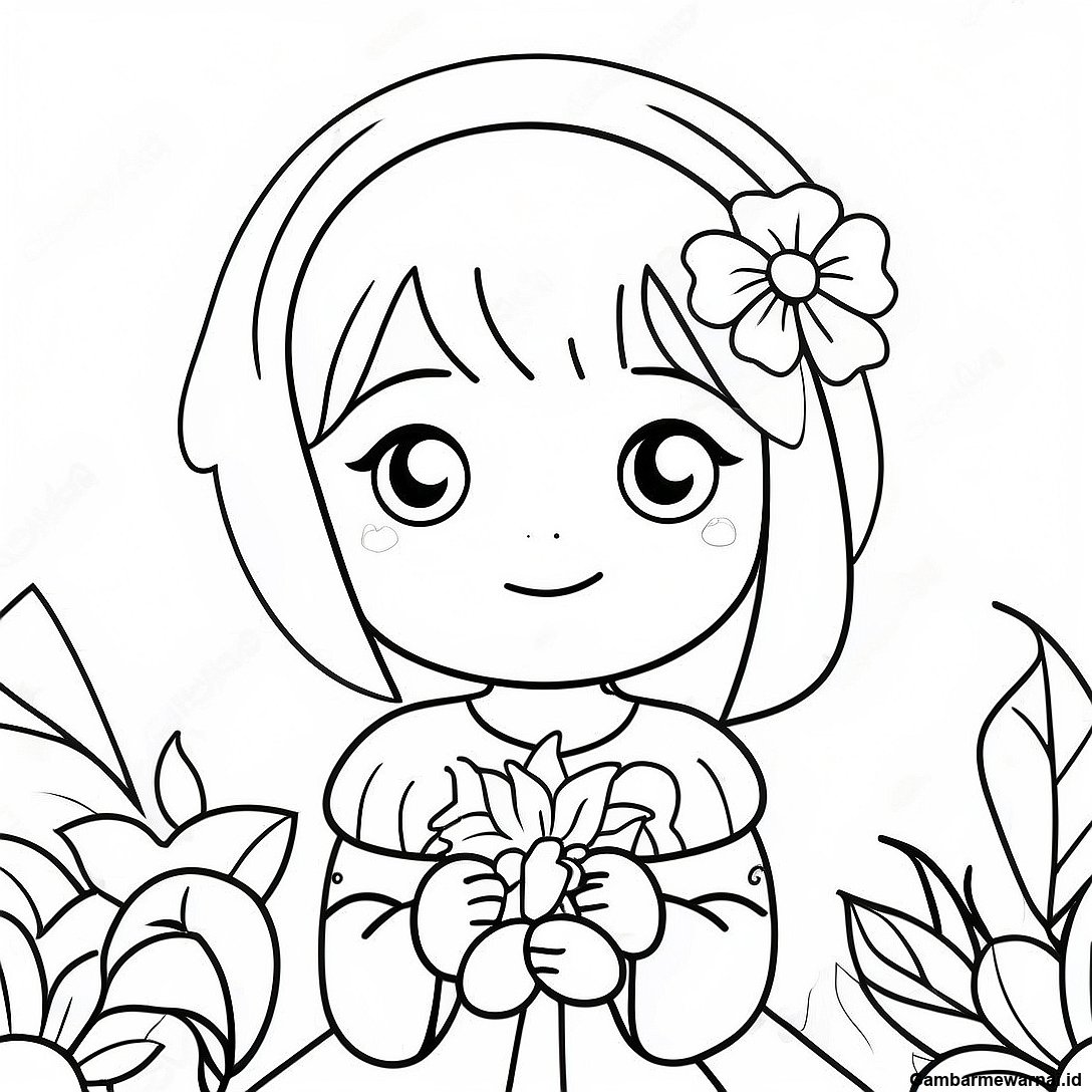 Halaman Mewarnai Gadis Anime Imut Dengan Bunga