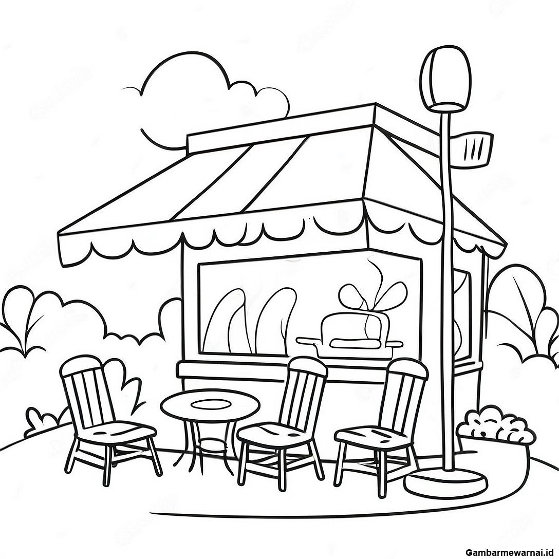 Halaman Mewarnai Kafe Imut Dengan Tempat Duduk Di Luar
