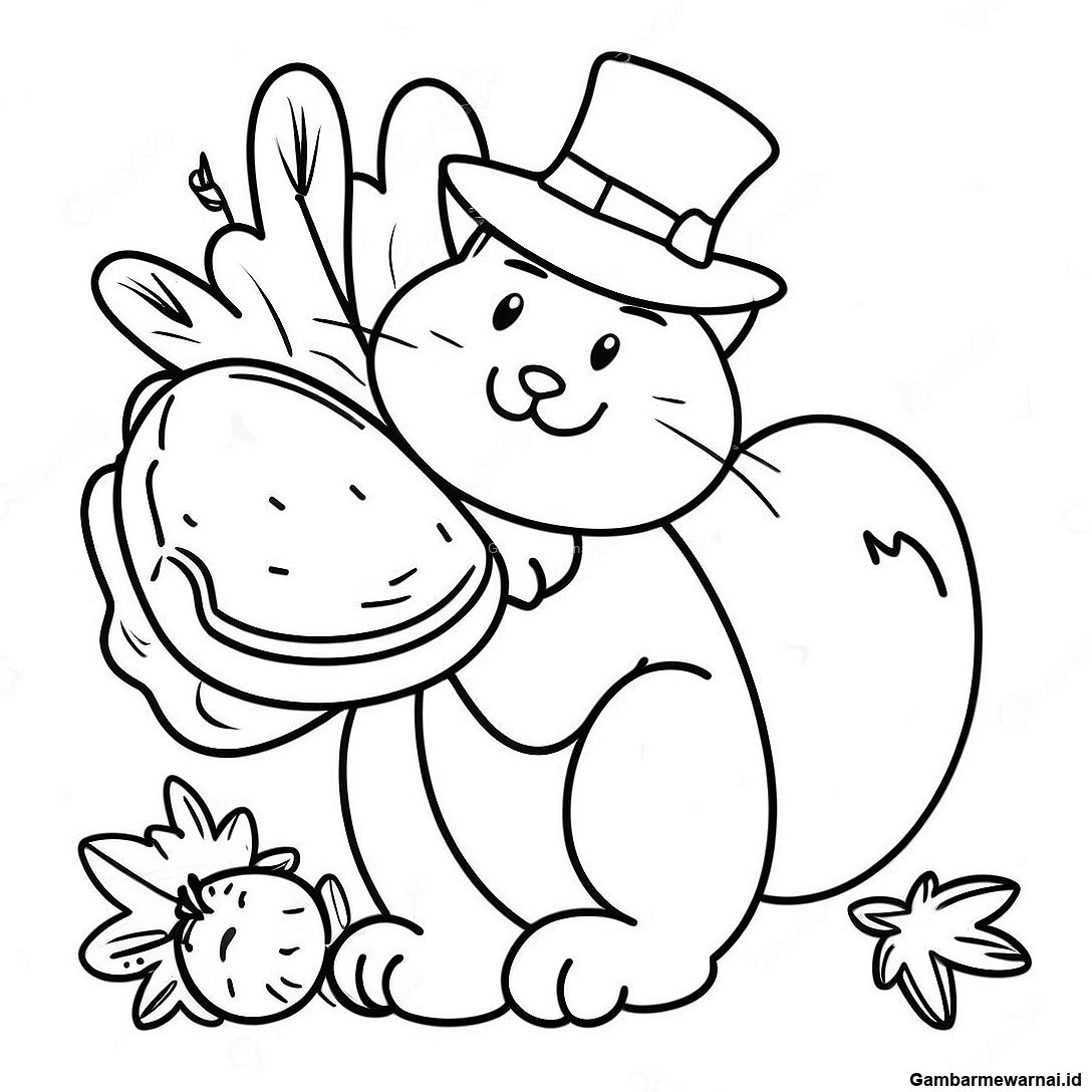 Halaman Mewarnai Kucing Hari Bersyukur Yang Ceria Dengan Kalkun