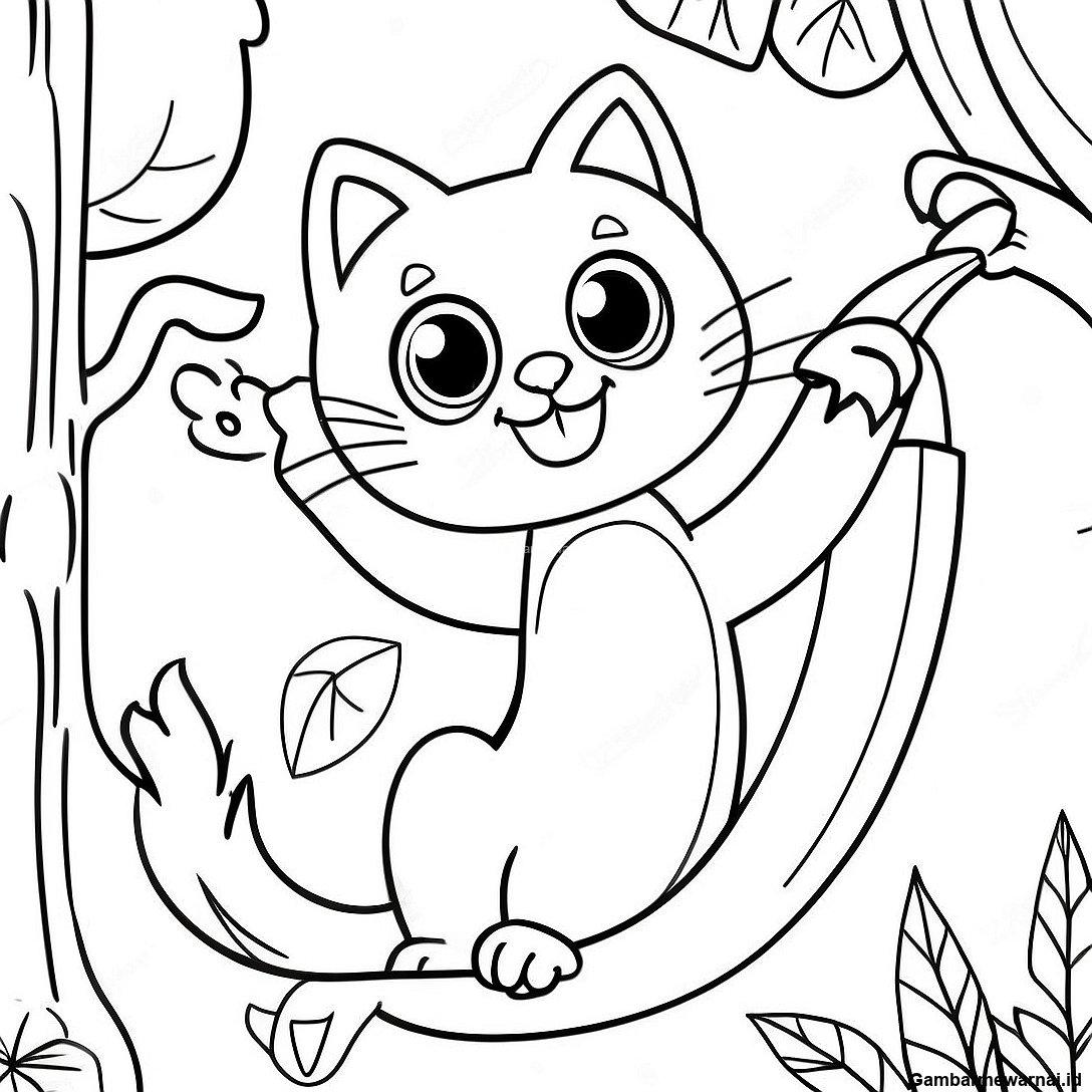 Halaman Mewarnai Kucing Pisang Yang Ceria Di Pohon