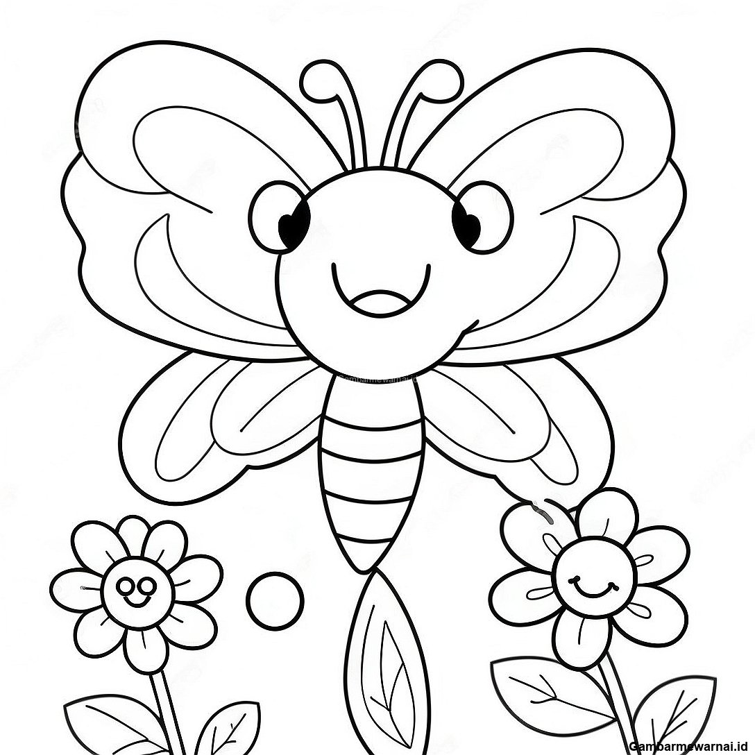 Halaman Mewarnai Kupu-Kupu Bunga Dengan Wajah Tersenyum