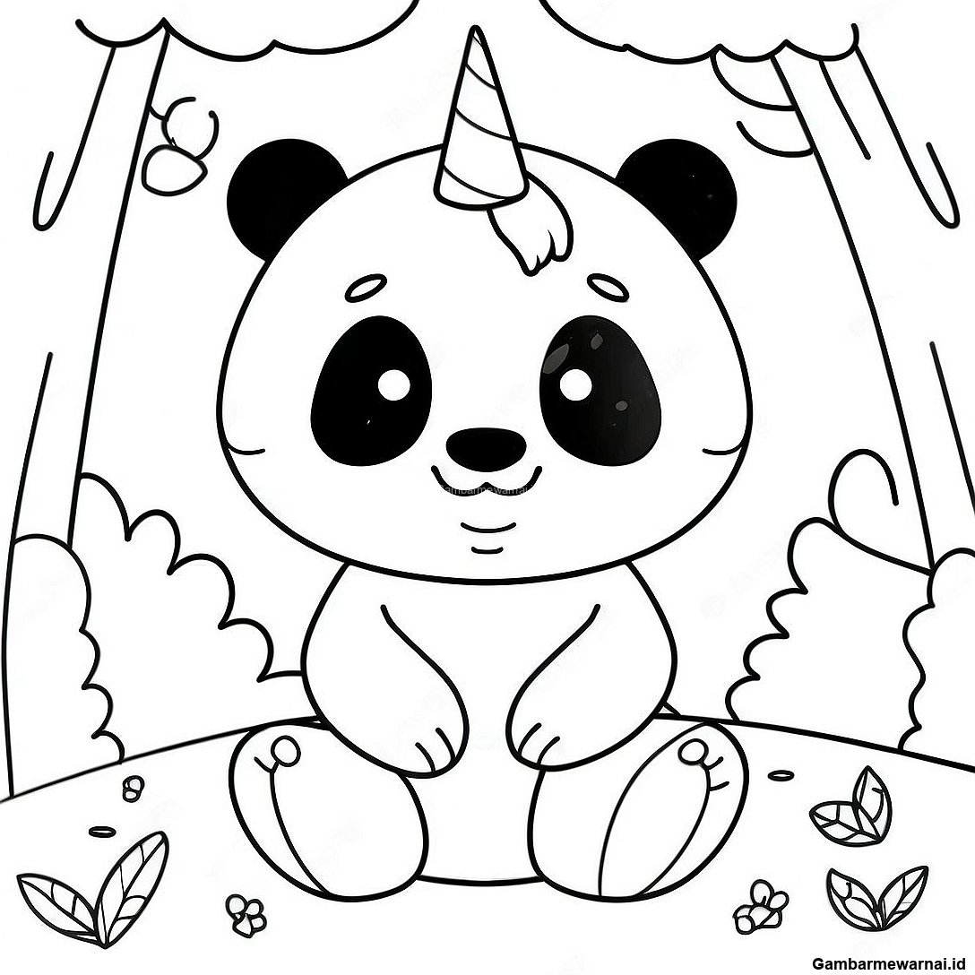 Halaman Mewarnai Panda Unicorn Imut Di Hutan Ajaib