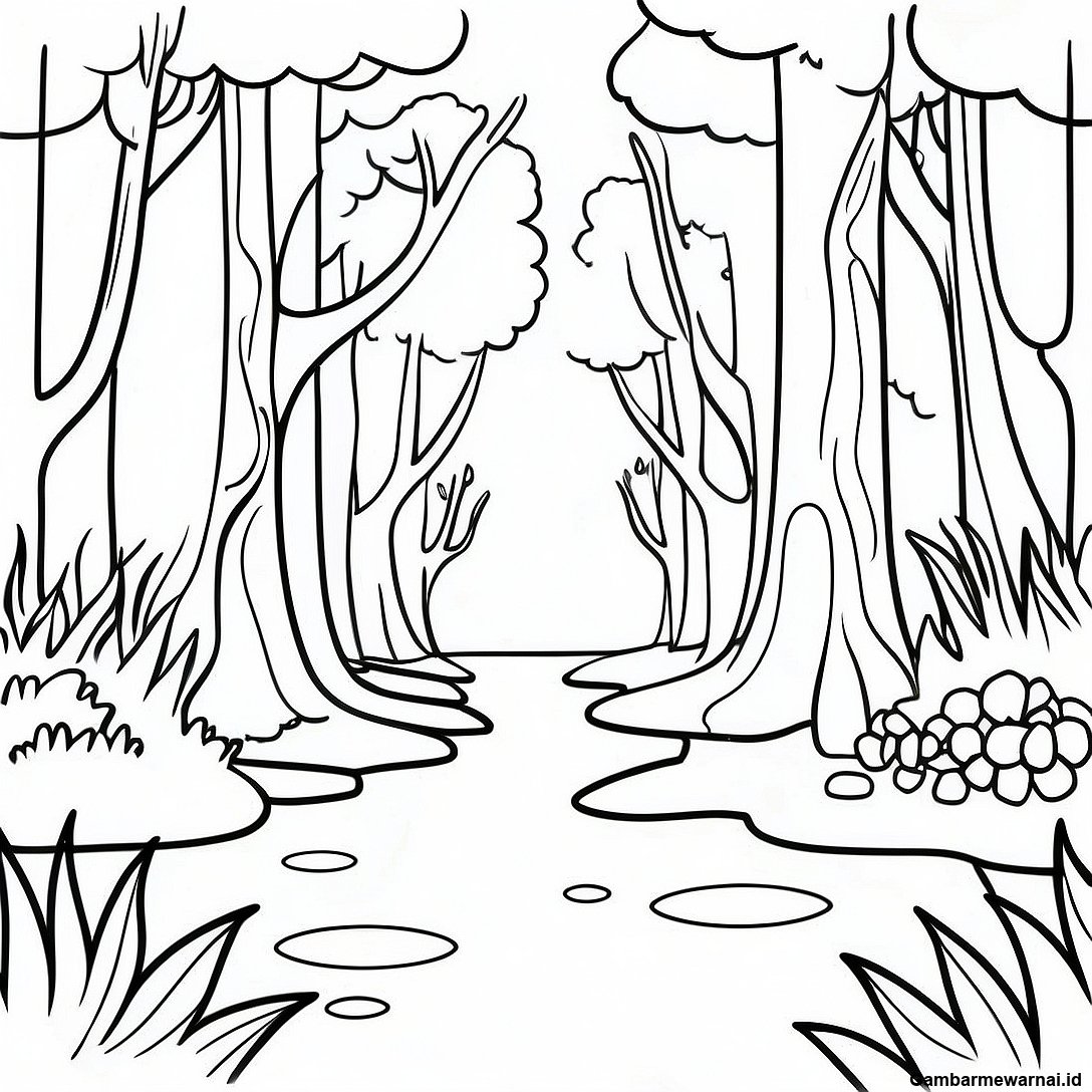 Halaman Mewarnai Pemandangan Hutan Yang Tenang
