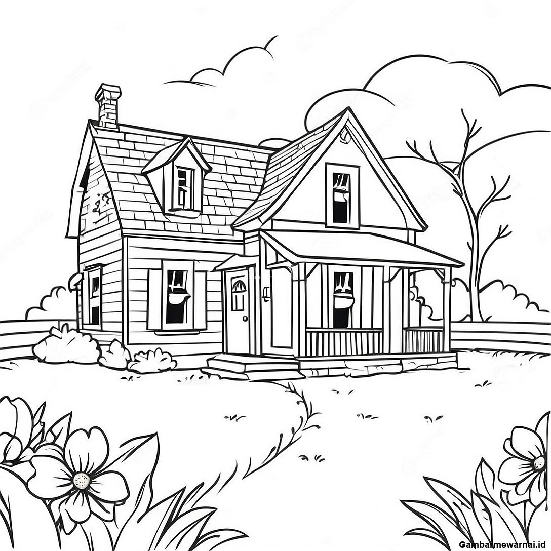 Halaman Mewarnai Rumah Pertanian Yang Menawan Dengan Taman