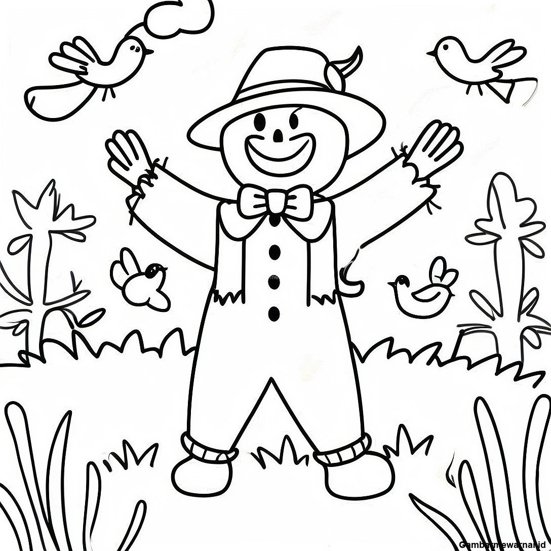 Halaman Mewarnai Scarecrow Bahagia Dengan Burung Berwarna