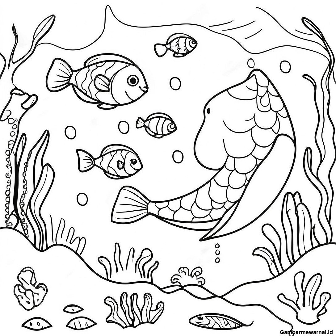 Halaman Mewarnai Seawing Pemandangan Bawah Laut Berwarna-Warni