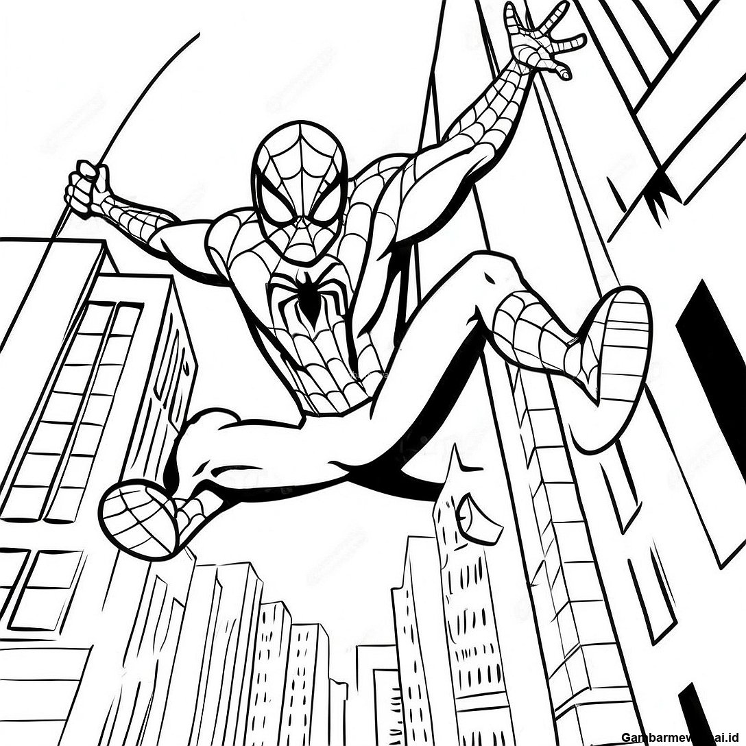 Gambar Mewarnai Spider Man Meluncur di Kota