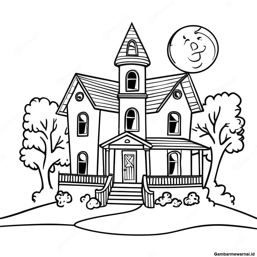 Rumah Hantu Dengan Bulan Purnama Halaman Mewarnai